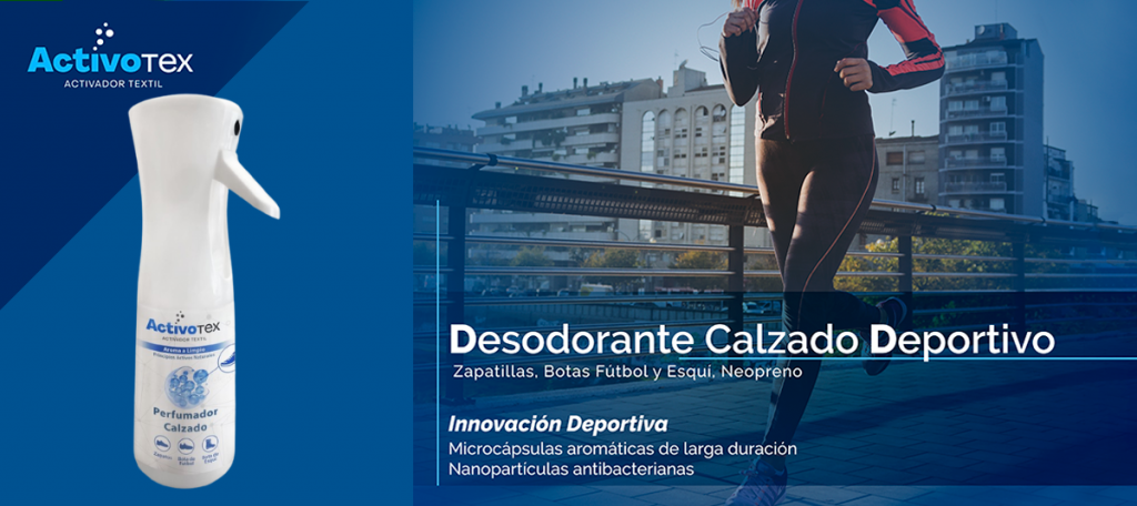 Innovador desodorante diseñado para cualquier tipo de calzado, desarrollado con microcápsulas aromáticas con olor a limpio y efecto de larga duración con nanopartículas de iones de plata antibacterianas. Este sistema elimina eficazmente los malos olores al tiempo que aporta un aroma fresco y duradero, ideal para mantener cualquier tipo de calzado en óptimas condiciones de frescura e higiene. Pulverizando directamente el calzado con ActivoTex, se neutralizan los olores sin necesidad de recurrir a productos convencionales que pierden su efecto rápidamente y pueden intensificar el mal olor a largo plazo.